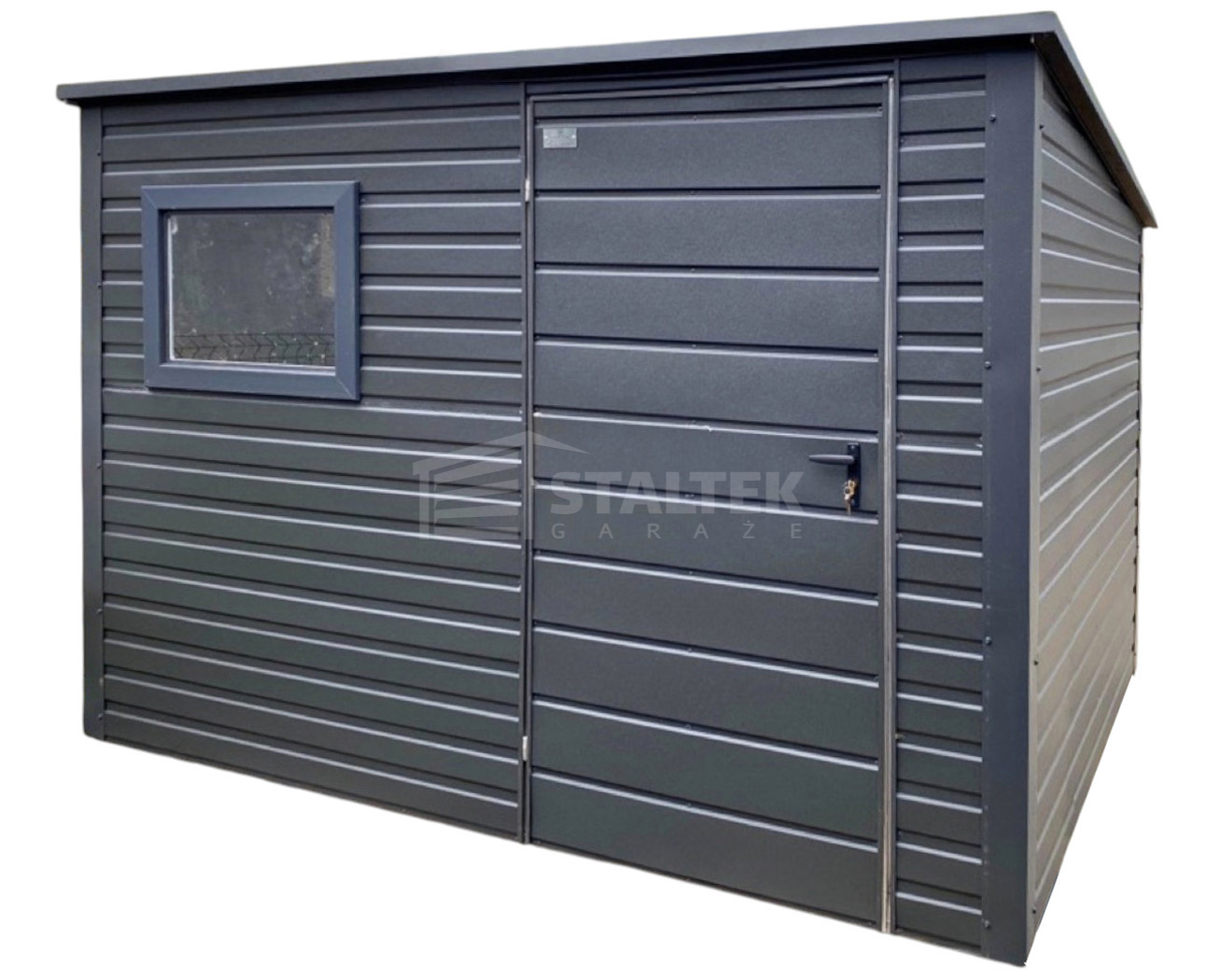 Schowek – domek ogrodowy 2,8×2 – drzwi – okno – antracyt – dach spad w tył ST237