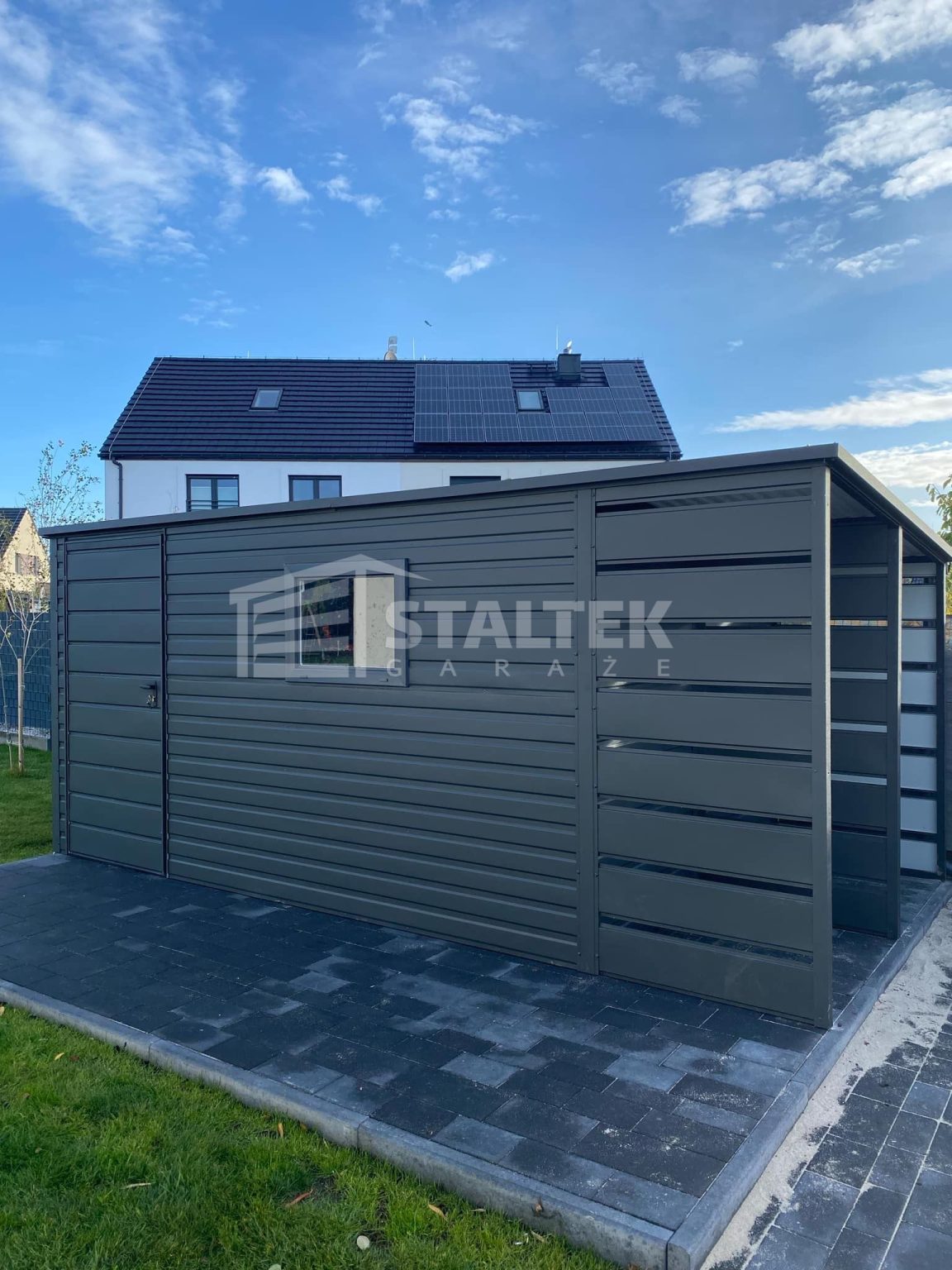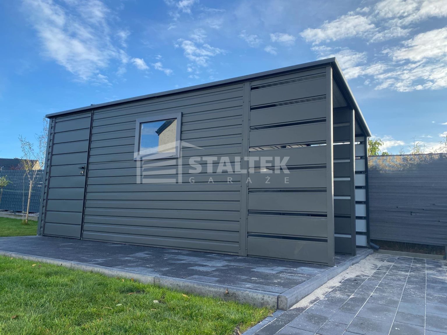 Schowek – Domek ogrodowy 3,8×2,5 + wiata 1,2 – drzwi – okno – Antracyt – dach spad w tył ST103
