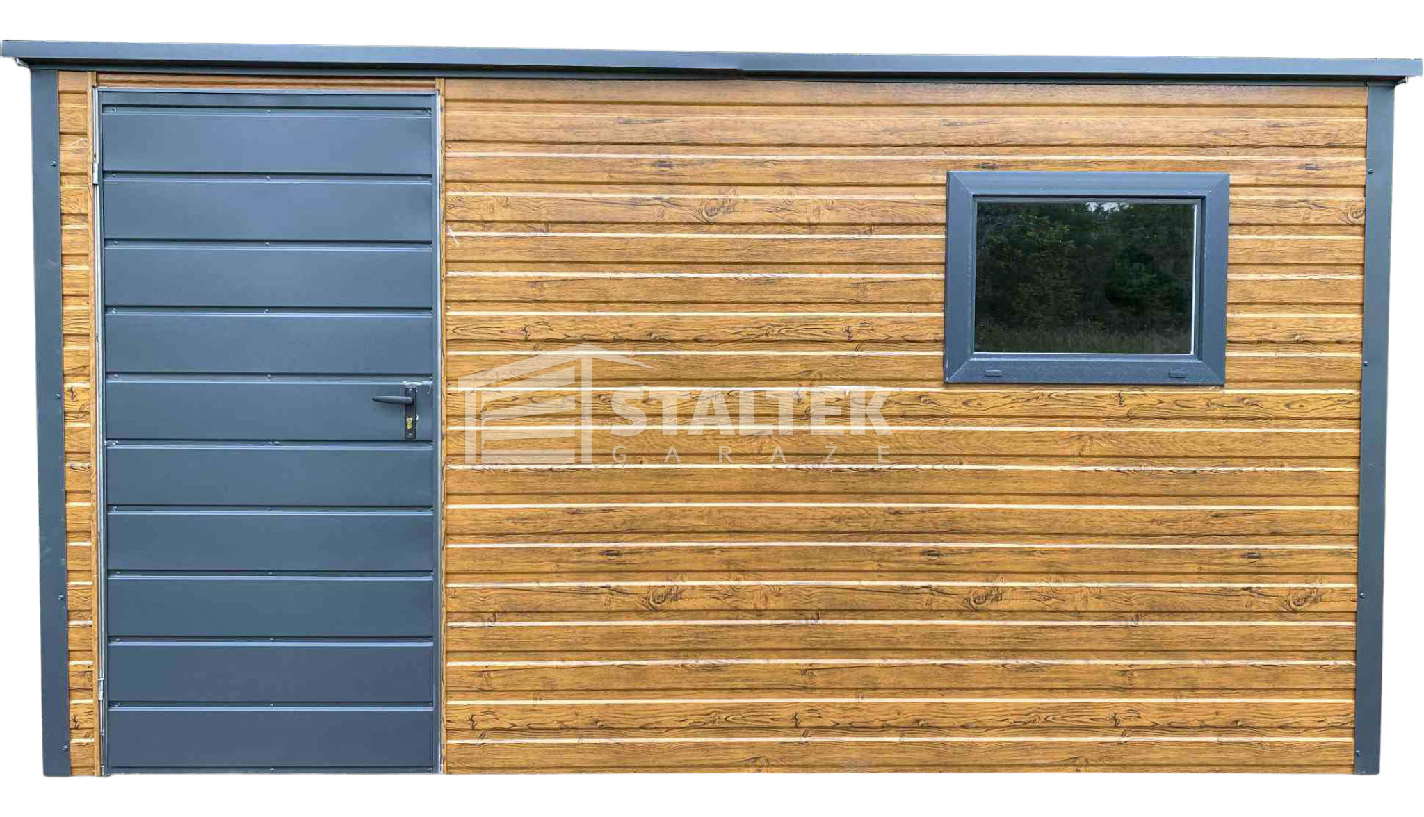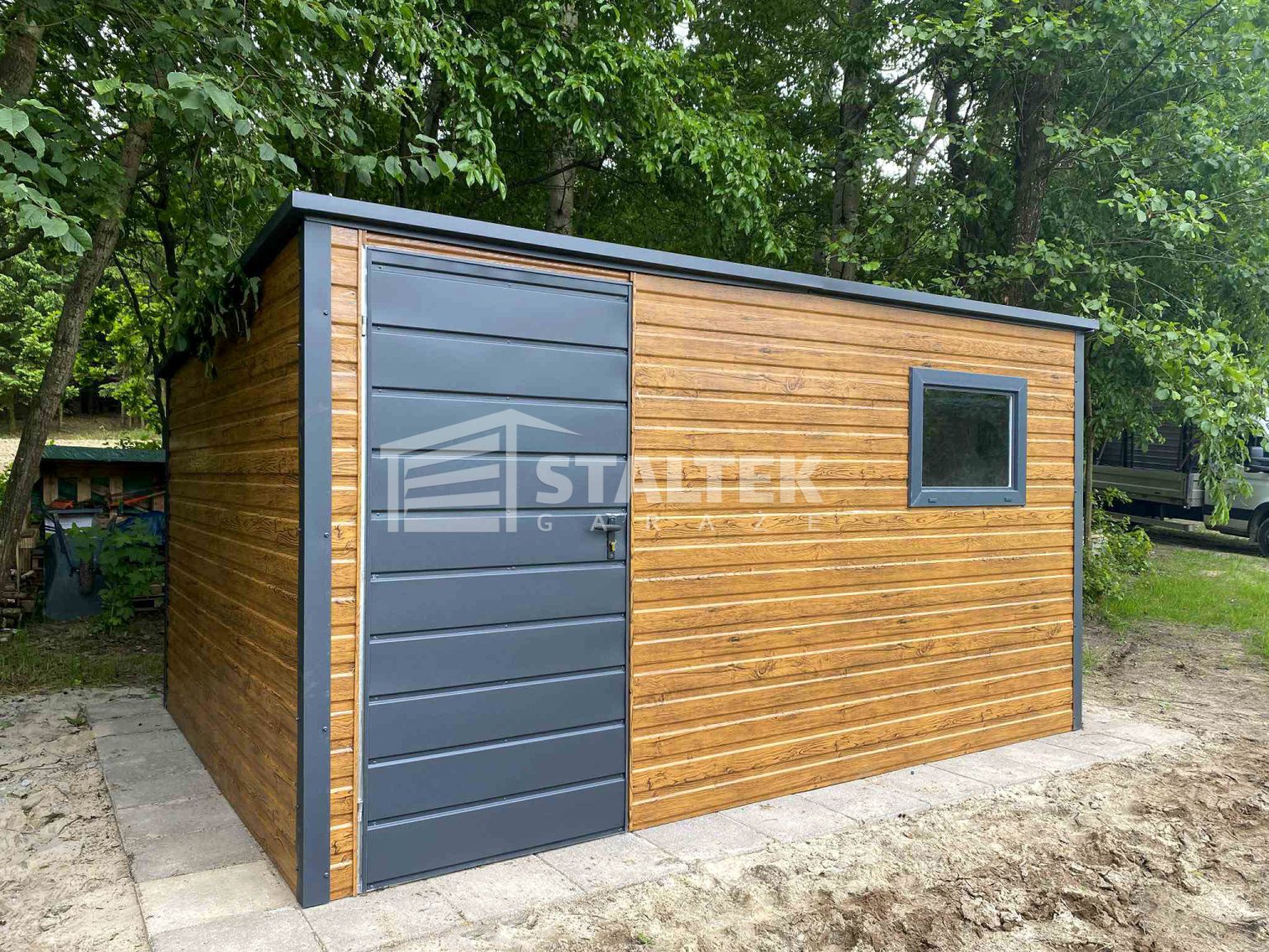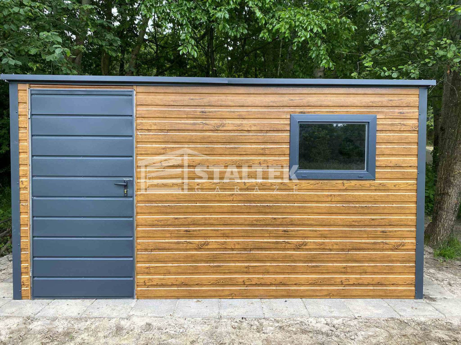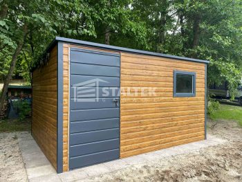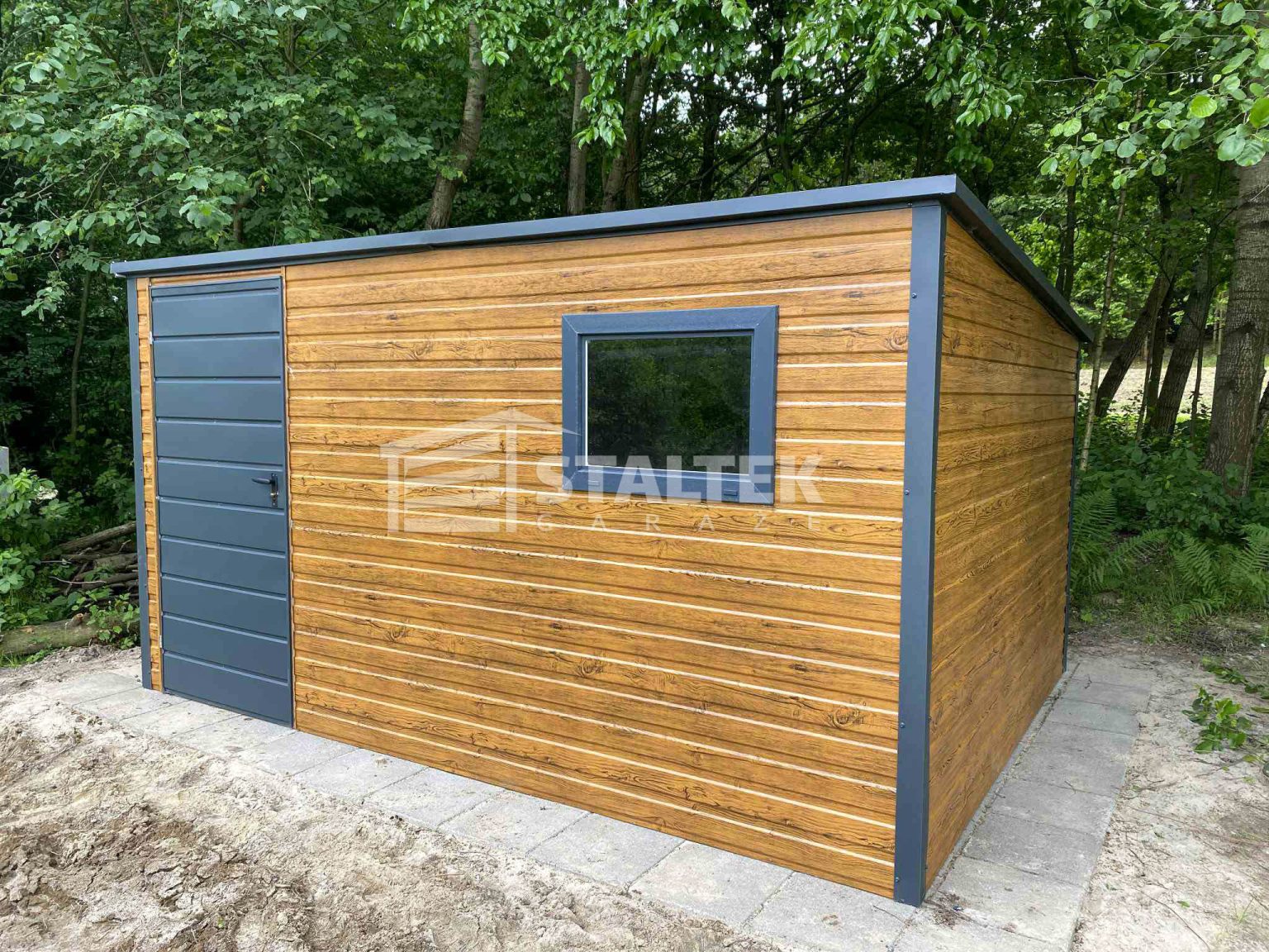 / Schowek – Domek Ogrodowy 3×2 – drzwi – okno – jasny orzech – antracyt – drewnopodobny – dach spad w tył ST158