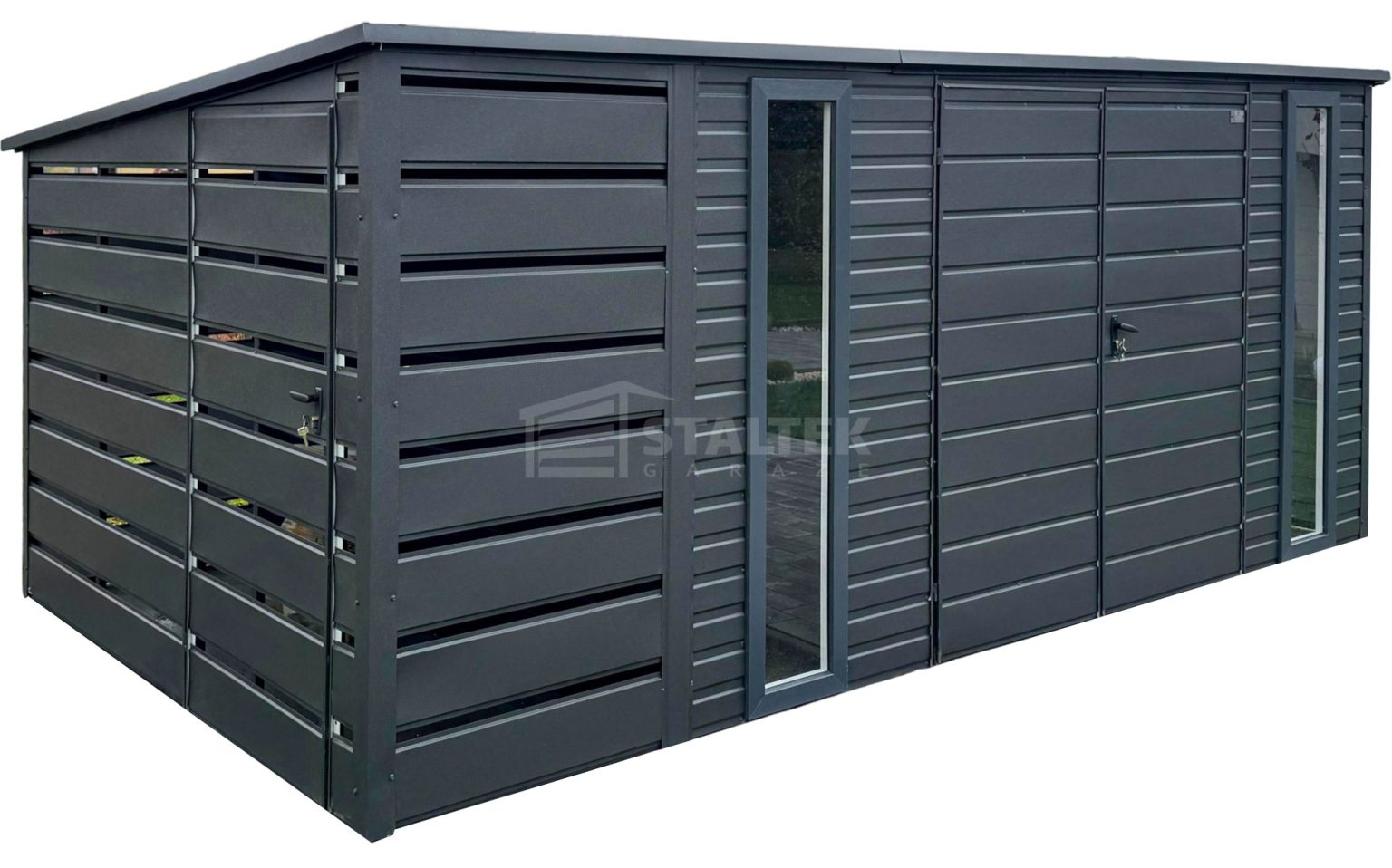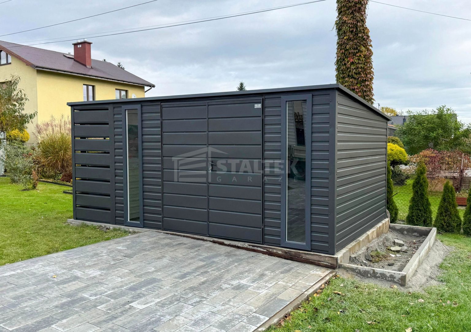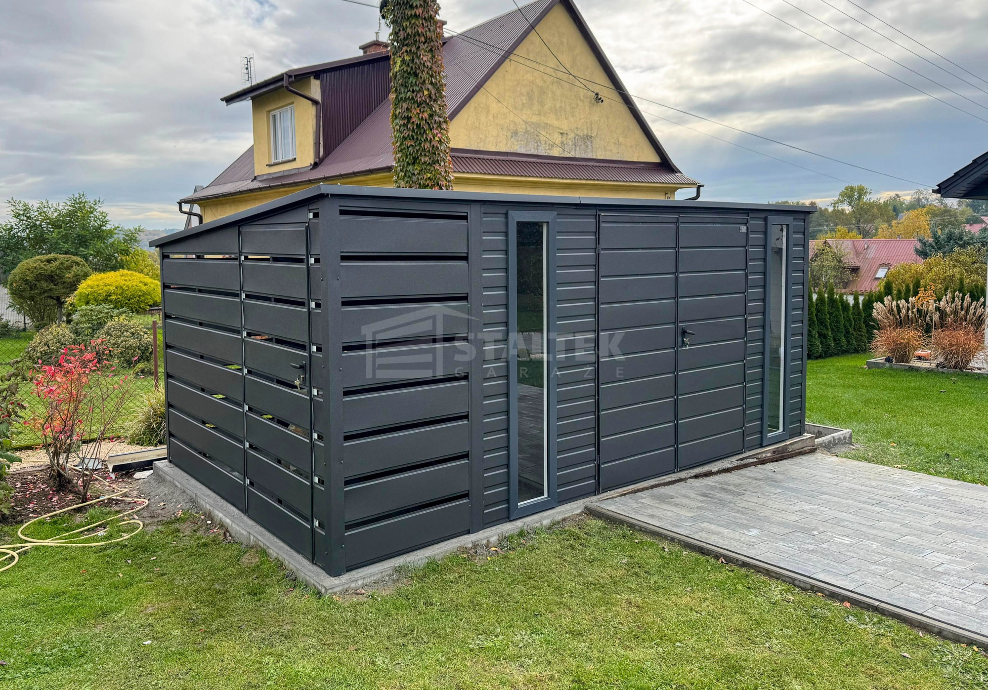 • wiata : 1×2,5 m zabudowana panelami z przodu, z tyłu i z boku kolor : antracyt mat 7016