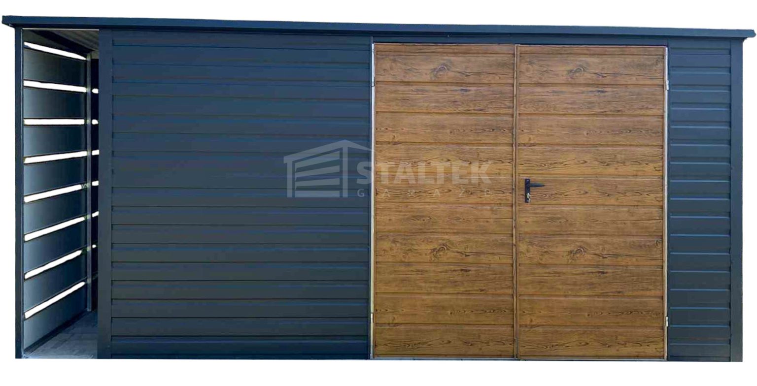 Schowek – Domek Ogrodowy 4,5x2m + wiata 0,5m – Brama – jasny orzech – antracyt – dach spad w tył ST182