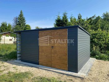 / Schowek – Domek Ogrodowy 4×3 – wiata 0,5×3 – brama – jasny orzech drewnopodobny – antracyt – dach spad w tył ST162
