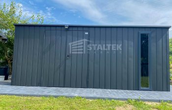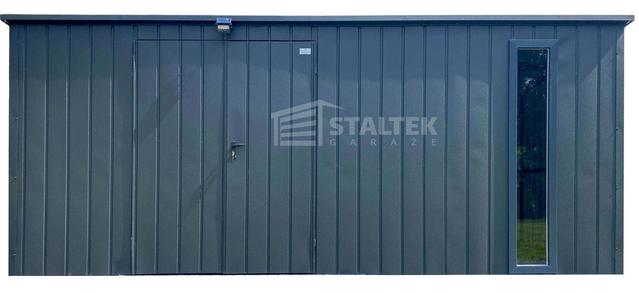 • szerokość : 6 m • długość : 2m • wiata : 0,5×2 m zabudowana przednia i tylna ściana blachą pion T17 kolor : antracyt mat 7016 • dach : spad w tył kolor : antracyt mat 7016 • brama dwuskrzydłowa 200×200 przetłoczenie pion T17 kolor : antracyt mat 7016 • okno PCV 40x200cm • Przetłoczenie ścian T17 pion kolor : antracyt mat 7016 • wysokość ścian z przodu : 213 cm • wysokość ścian z tyłu : 190 cm • Konstrukcja z profili zamkniętych mix 30×30 30×50 40×60 + kątownik 40×40 • Zamek + Klucze • nity + wkręty w kolorze garażu • obróbki ścian • obróbki dachu