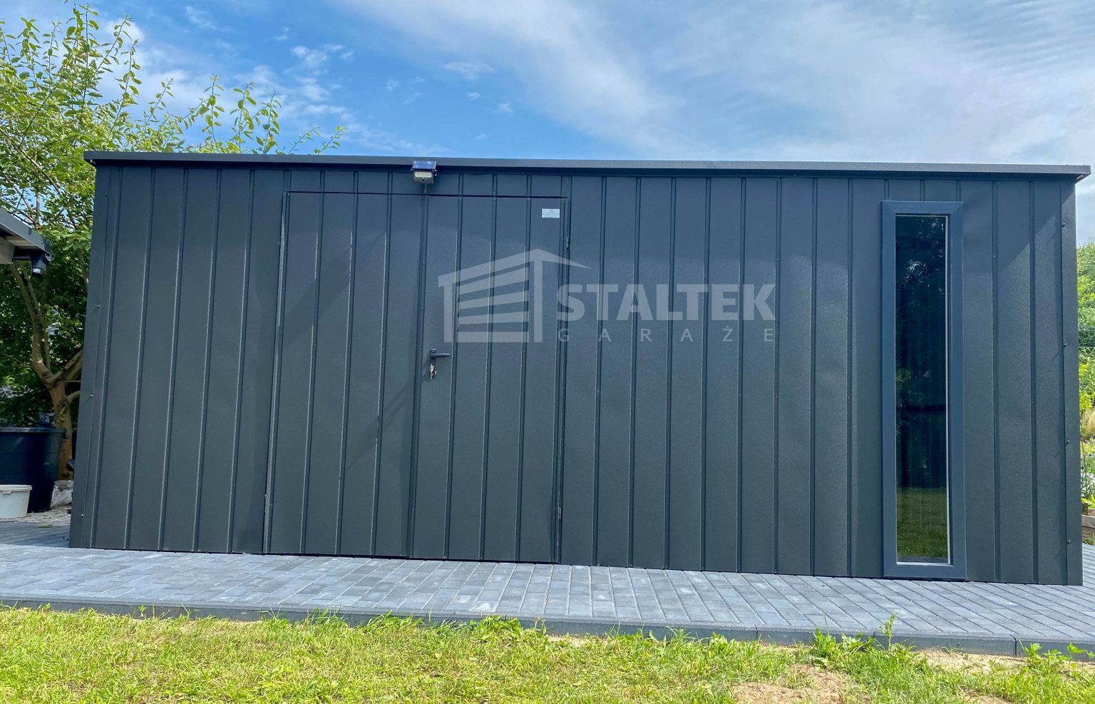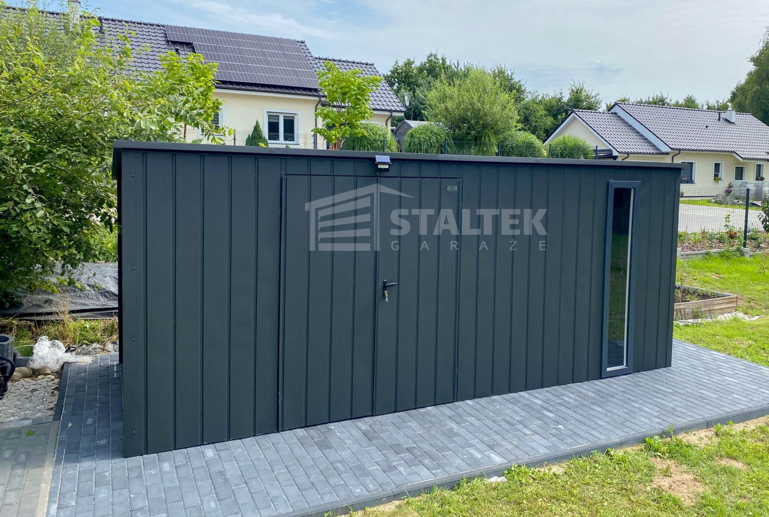 • wiata : 0,5×2 m zabudowana przednia i tylna ściana blachą pion T17 kolor : antracyt mat 7016