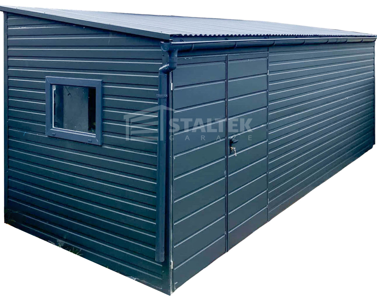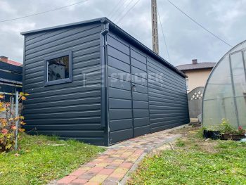 Schowek – Domek ogrodowy 5×2,5m – Brama dwuskrzydłowa – okno – antracyt – dach spad w przód ST183