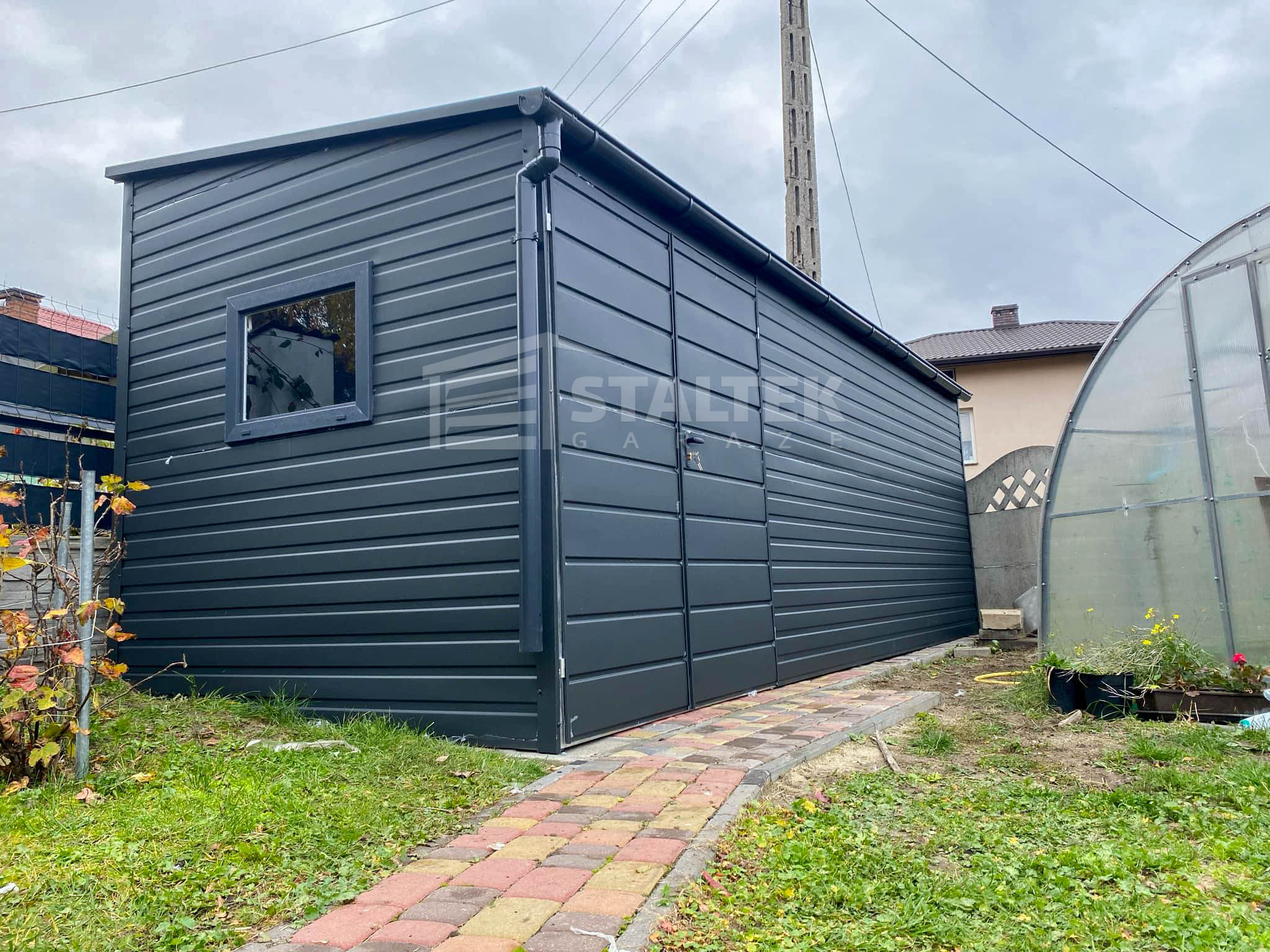 / Schowek – Domek ogrodowy 5×2,5m – Brama dwuskrzydłowa – okno – antracyt – dach spad w przód ST183