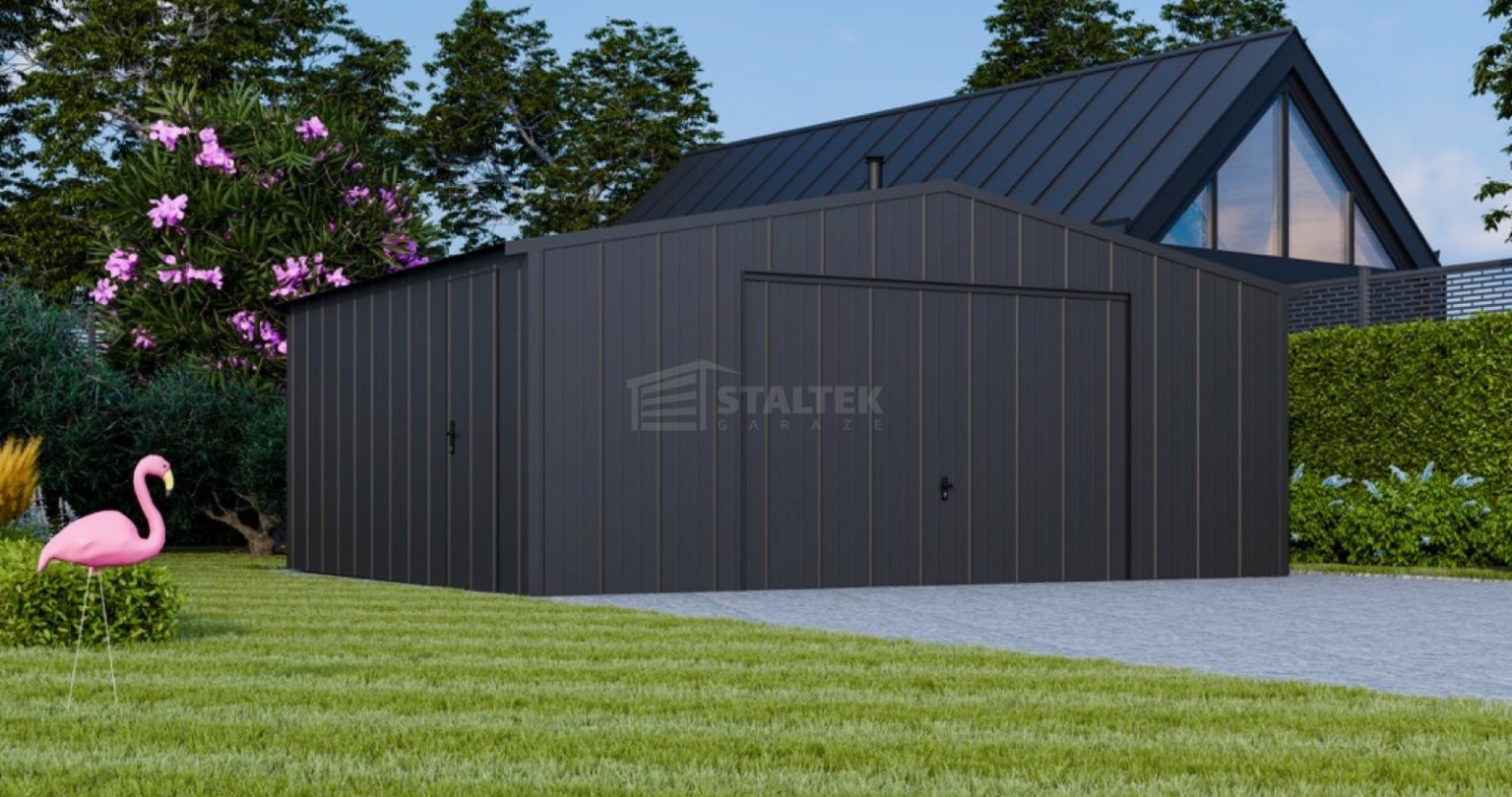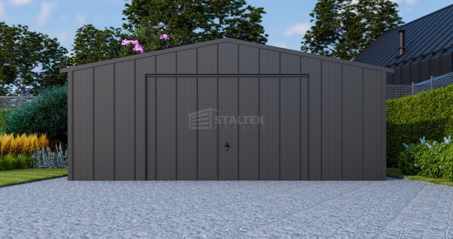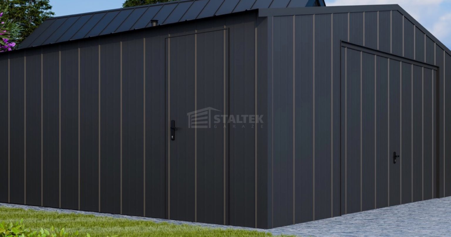 Garaż blaszany 6×6 – brama uchylna – drzwi – blacha na rąbek – dach dwuspadowy ST207