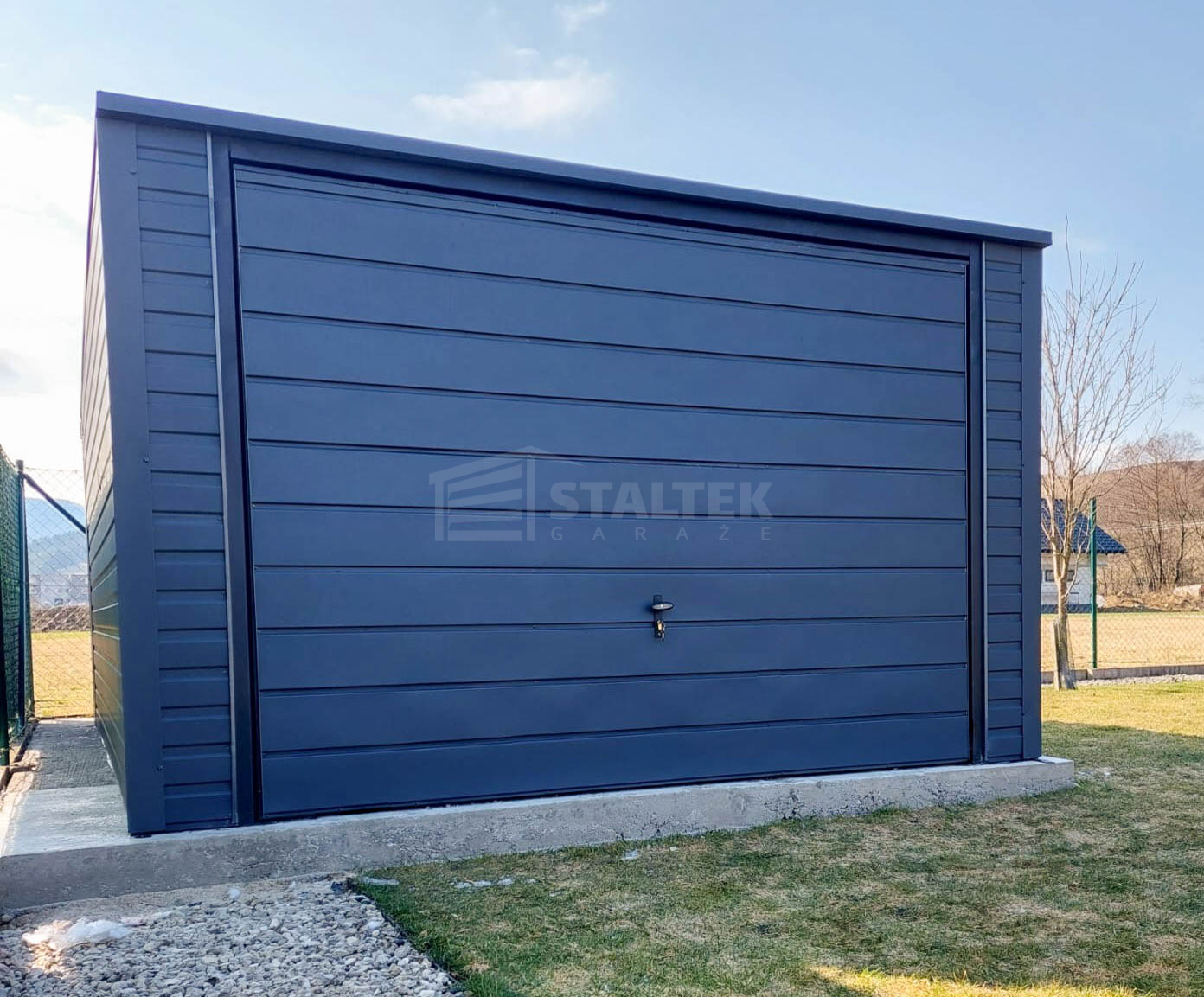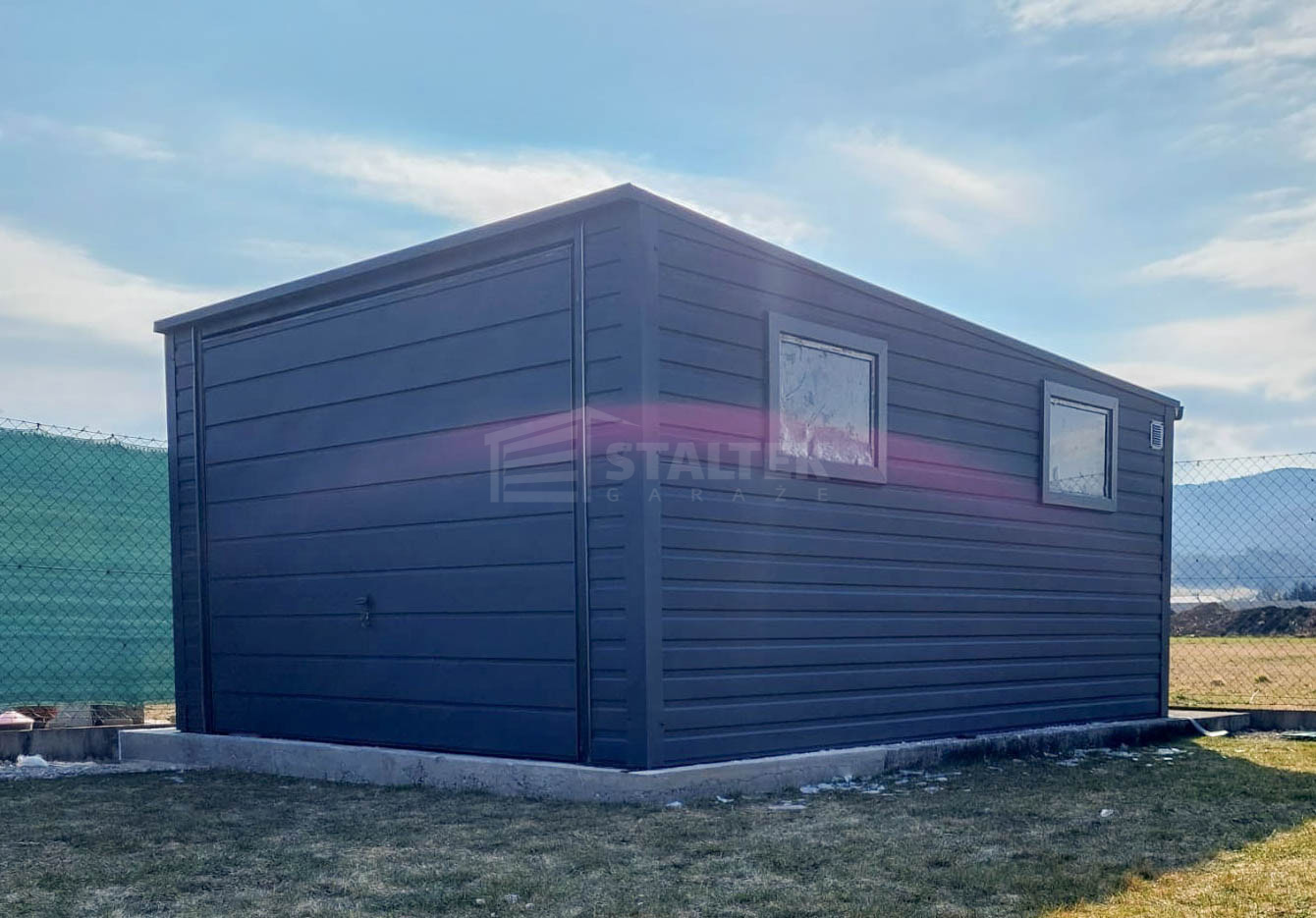 Garaż blaszany 3,5x5m – brama uchylna – 2x okno – antracyt – dach spad do tyłu ST239