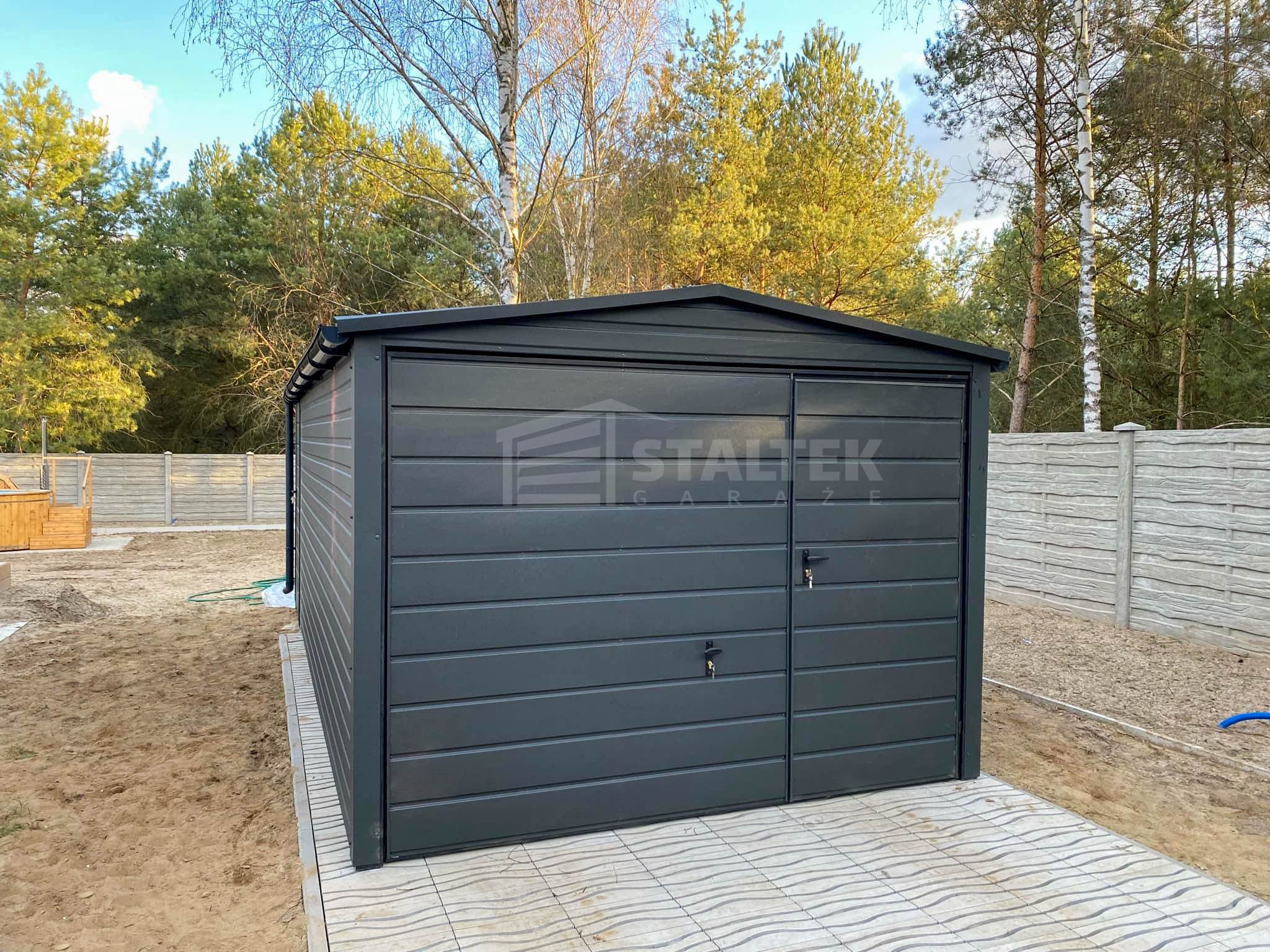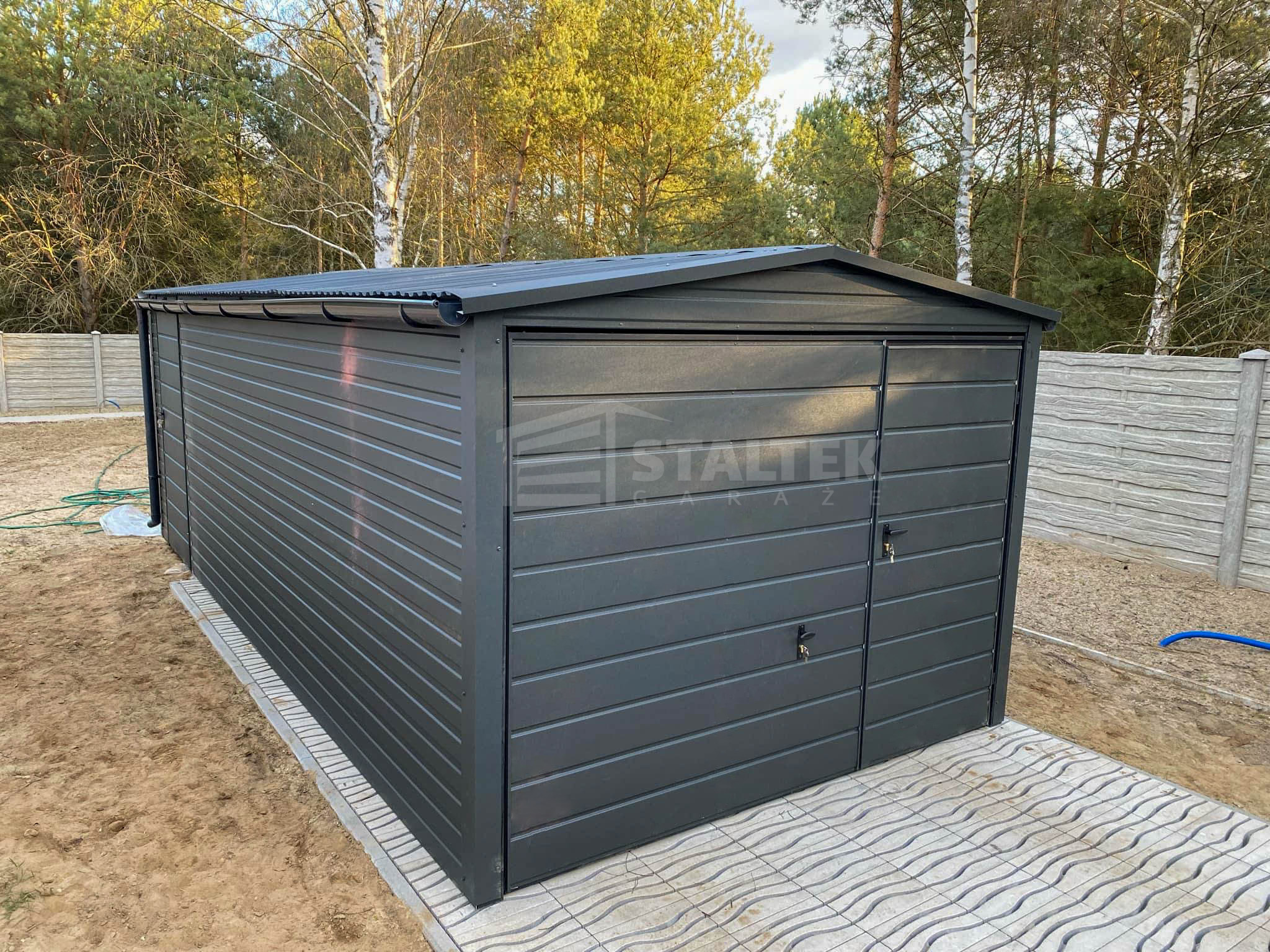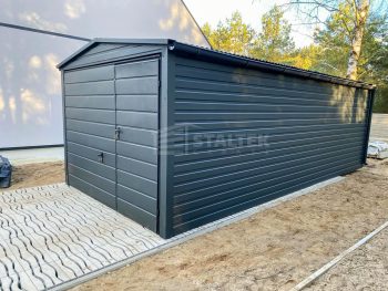 / Garaż blaszany 3x6m – Brama uchylna – drzwi Antracyt Dach dwuspadowy – rynny ST171