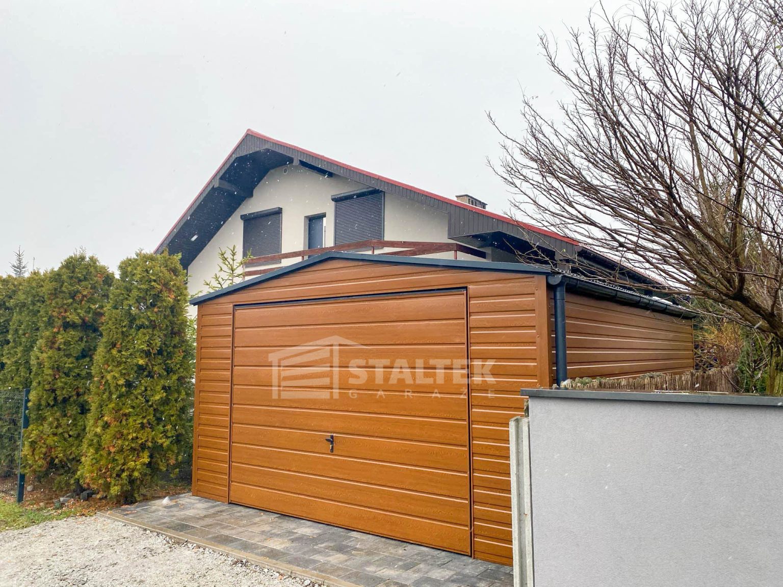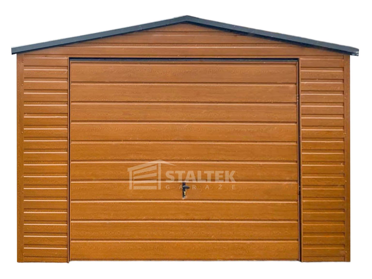 Garaż blaszany 4x4m – Brama uchylna – jasny orzech – drewnopodobny – dach dwuspadowy – rynna ST189