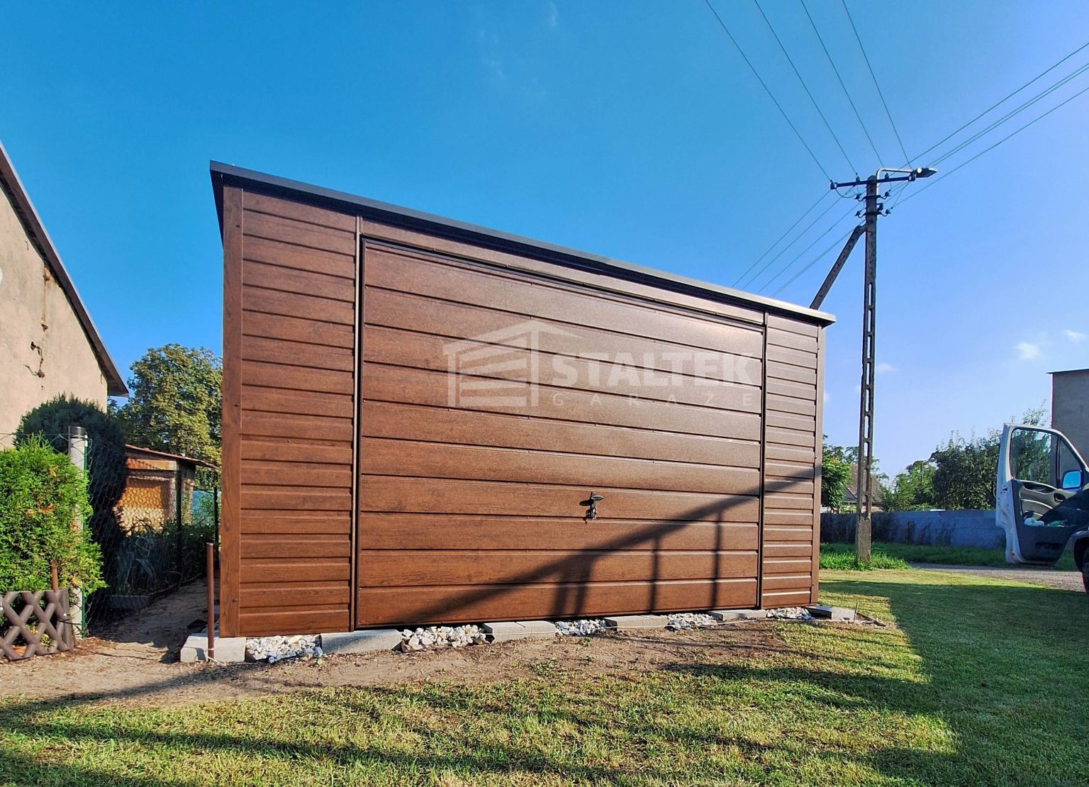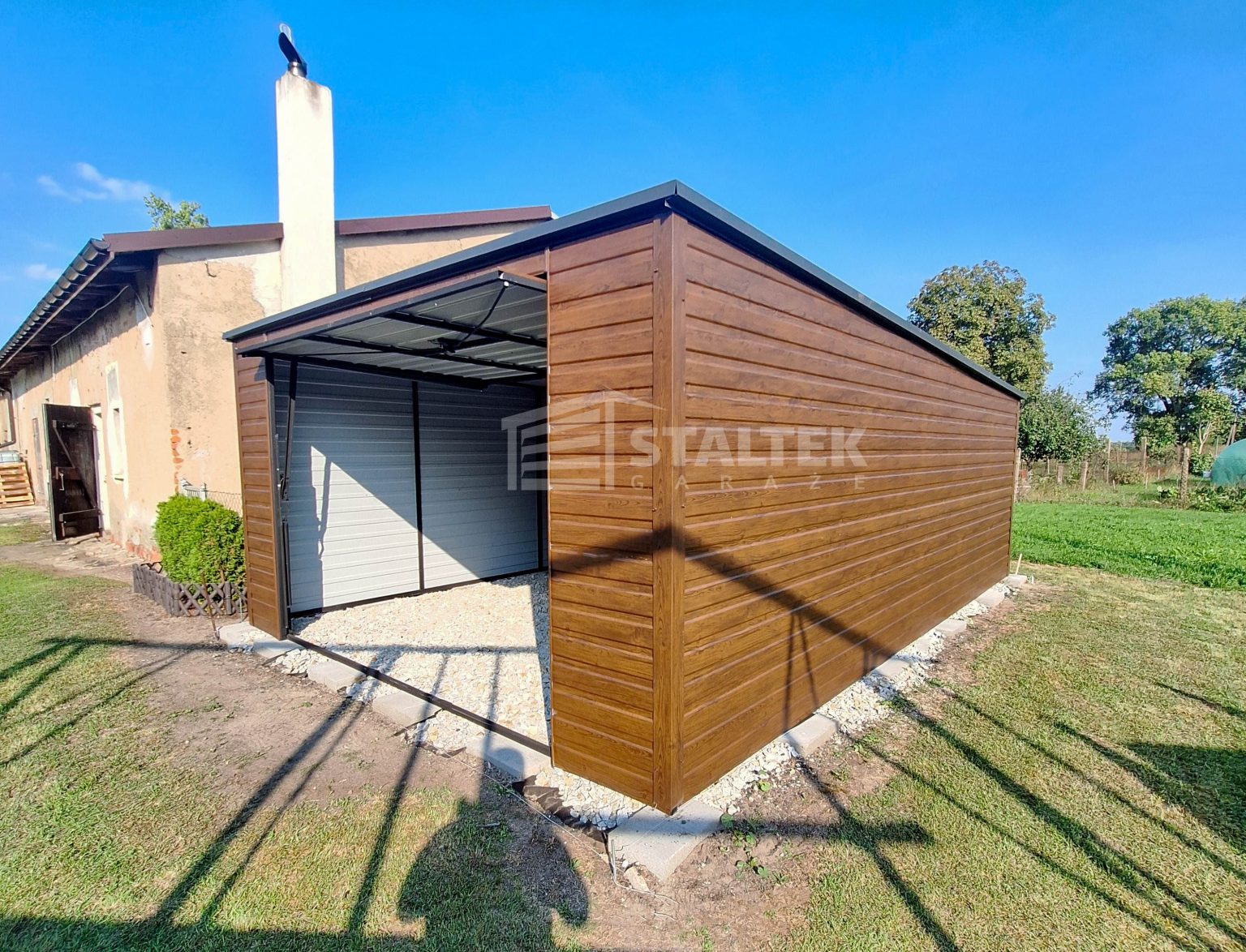 Garaż Blaszany 4×5 Brama uchylna – rynna – ciemny orzech – drewnopodobny – dach Spad w tył ST169