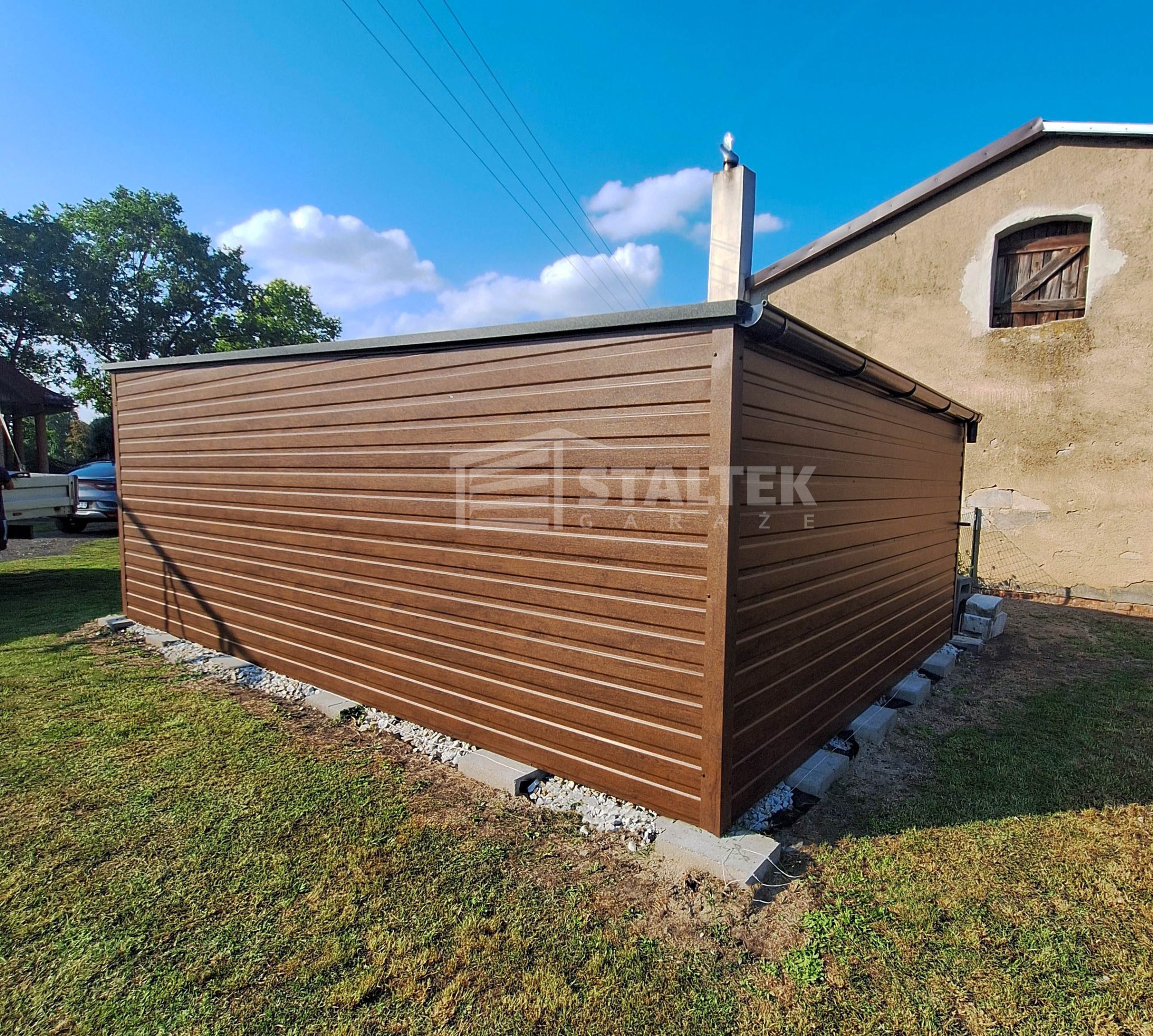 / Garaż Blaszany 4×5 Brama uchylna – rynna – ciemny orzech – drewnopodobny – dach Spad w tył ST169
