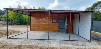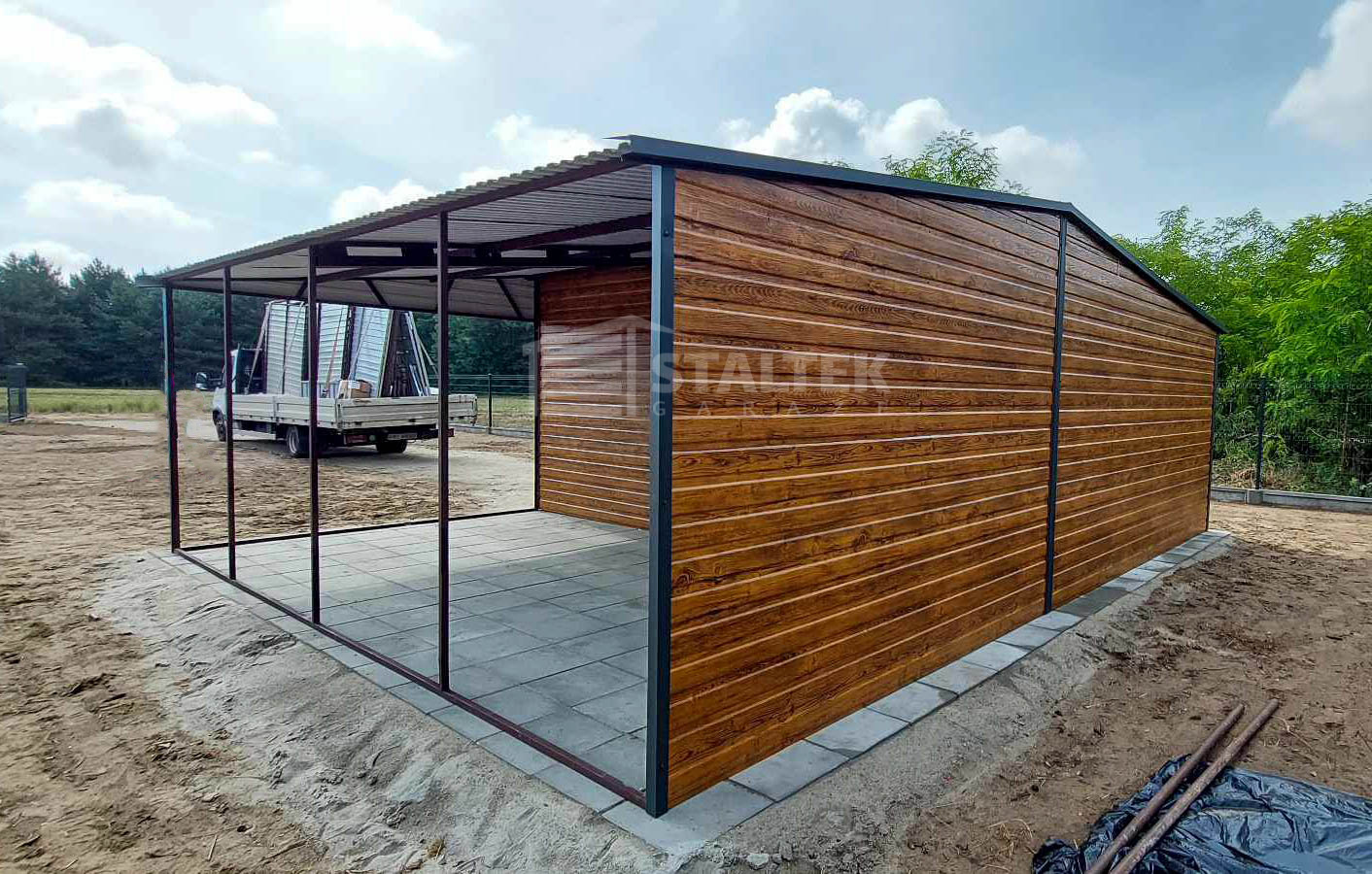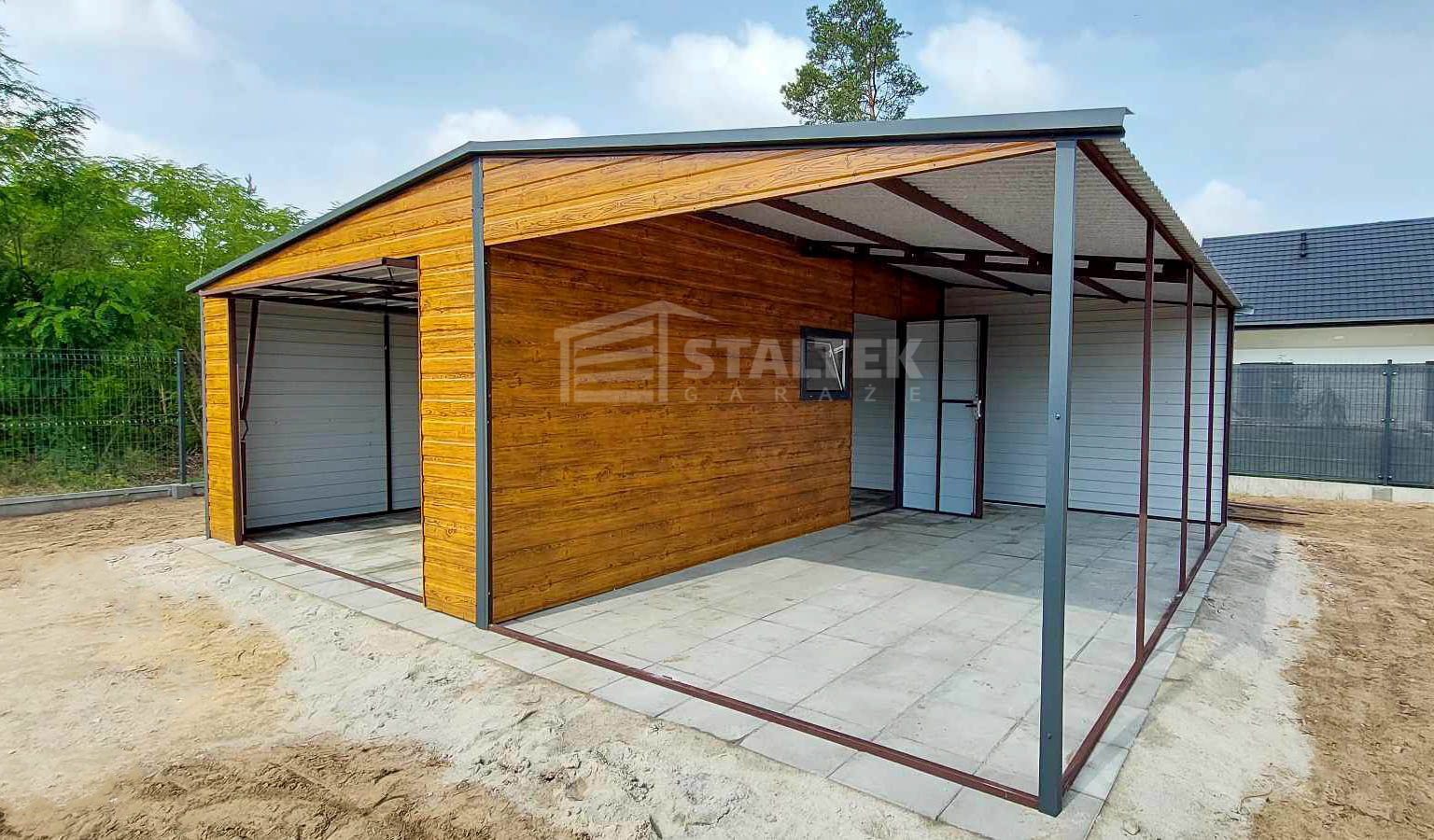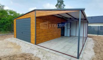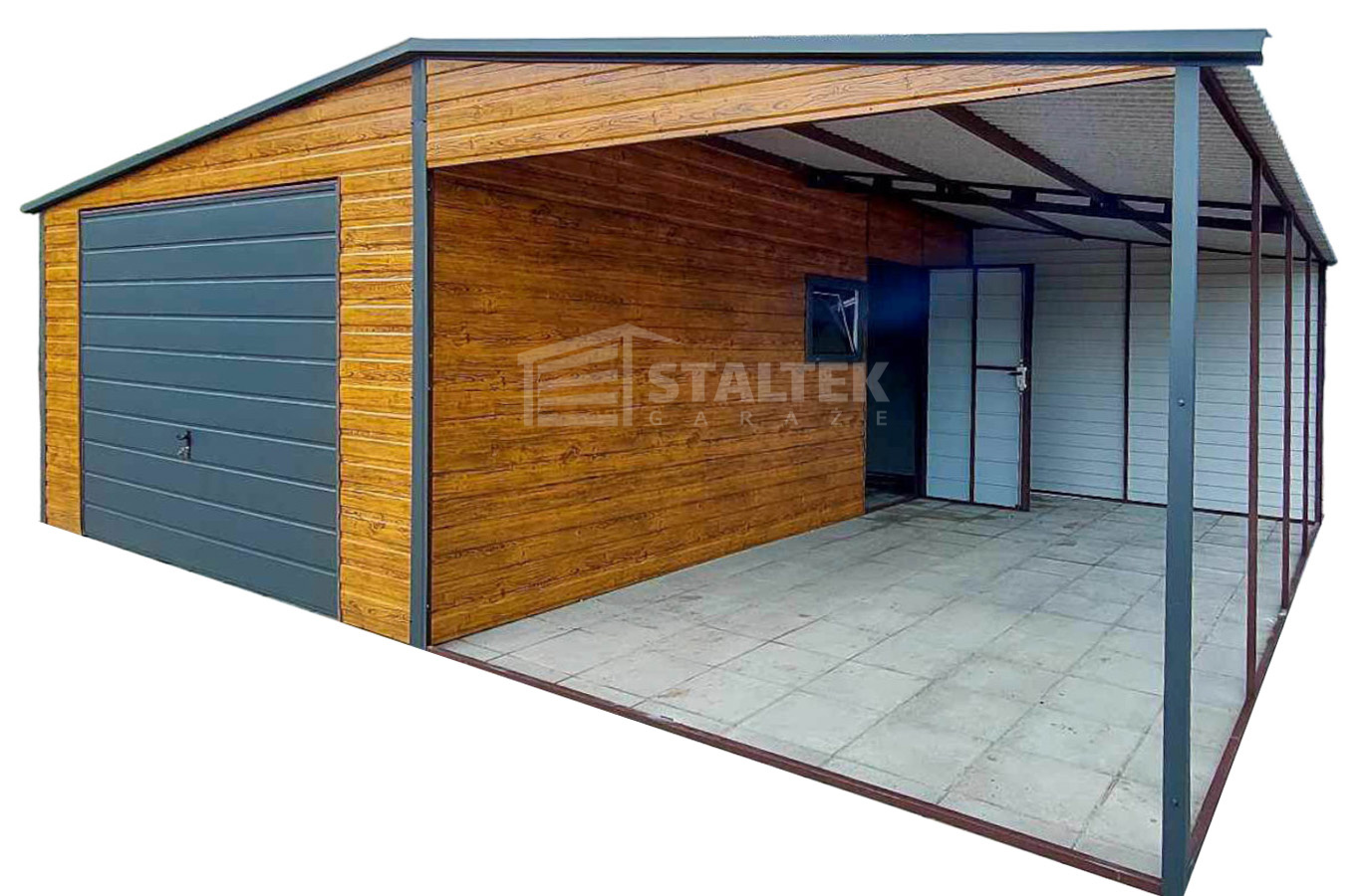 Garaż blaszany 4×6 + wiata 4m – Brama uchylna – Drzwi – okno – jasny orzech drewnopodobny Dach dwuspadowy ST119