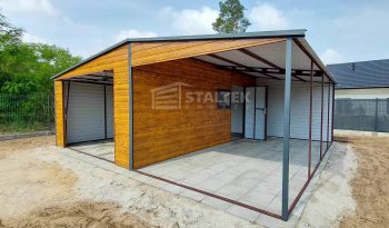 / Garaż blaszany 4×6 + wiata 4m – Brama uchylna – Drzwi – okno – jasny orzech drewnopodobny Dach dwuspadowy ST119