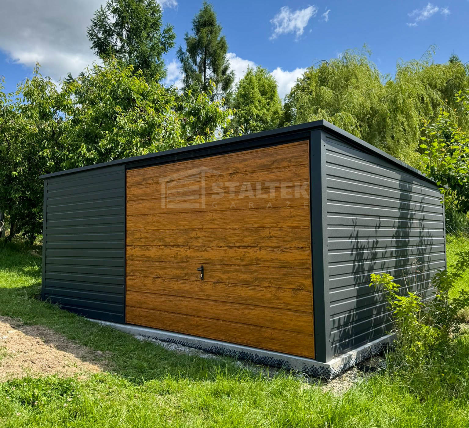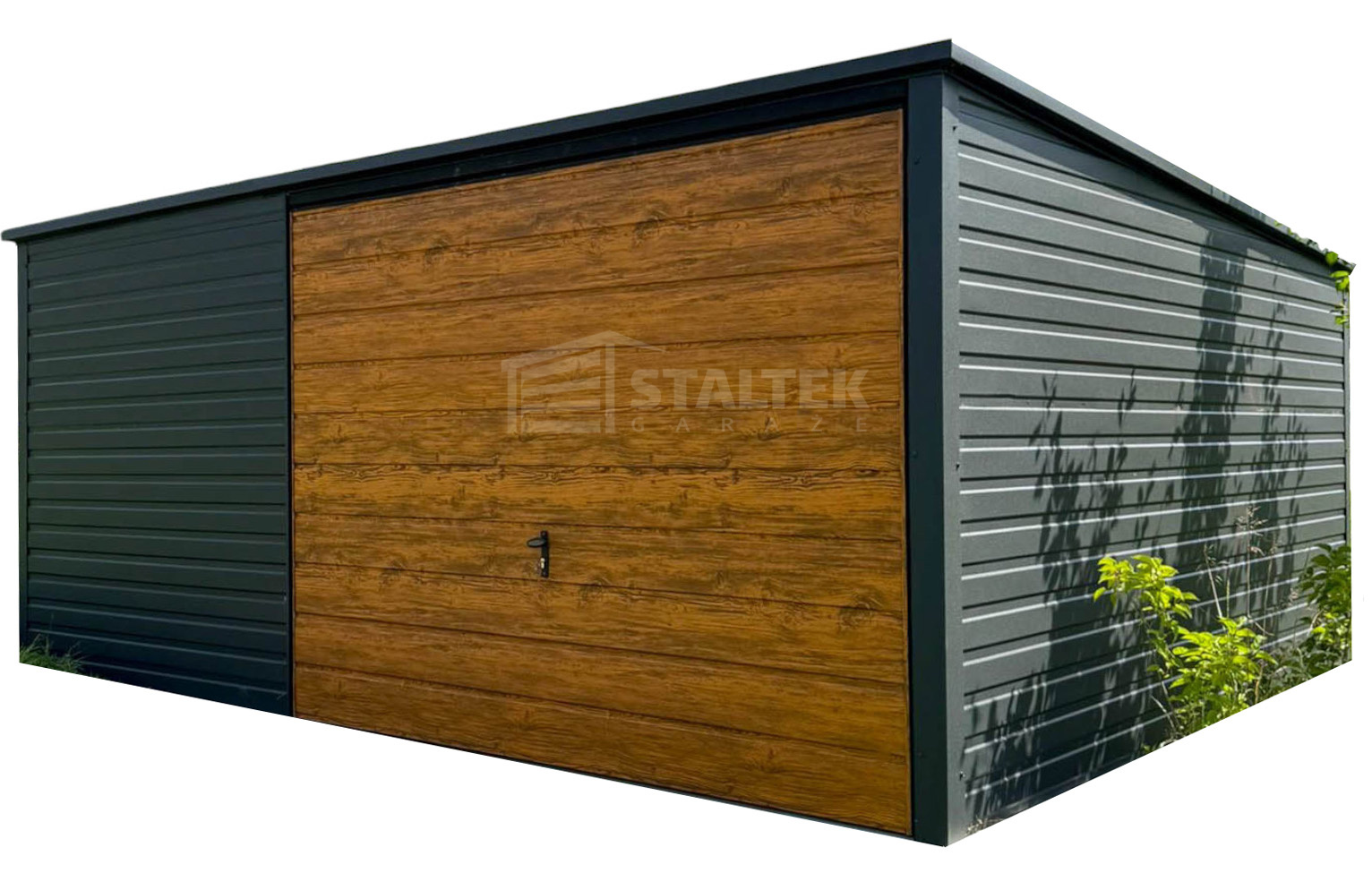 Garaż Blaszany 5×4 Brama uchylna – Antracyt + jasny orzech – drewnopodobny – dach Spad w tył ST172