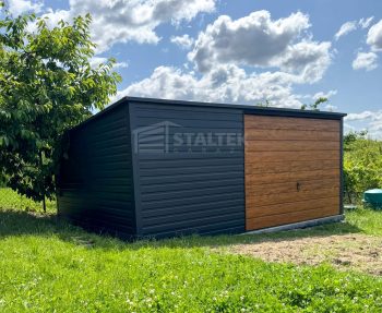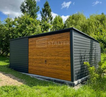 / Garaż Blaszany 5×4 Brama uchylna – Antracyt + jasny orzech – drewnopodobny – dach Spad w tył ST172