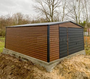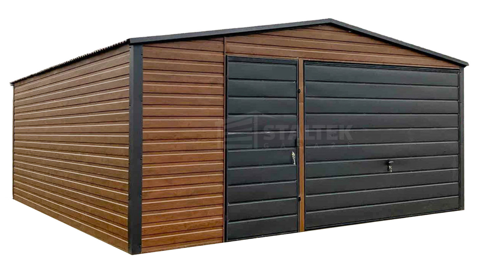 Garaż blaszany 5x6m – Brama uchylna – Ciemny orzech – drewnopodobny – dach dwuspadowy ST173