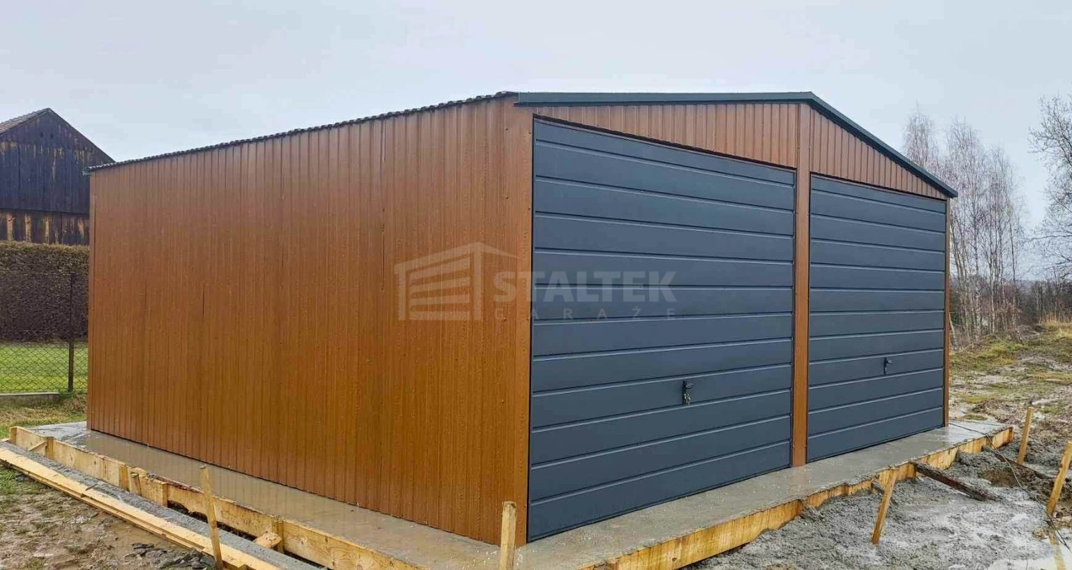 / Garaż blaszany 6×6 2x Brama + drzwi jasny orzech drewnopodobny + antracyt Dach dwuspadowy ST110