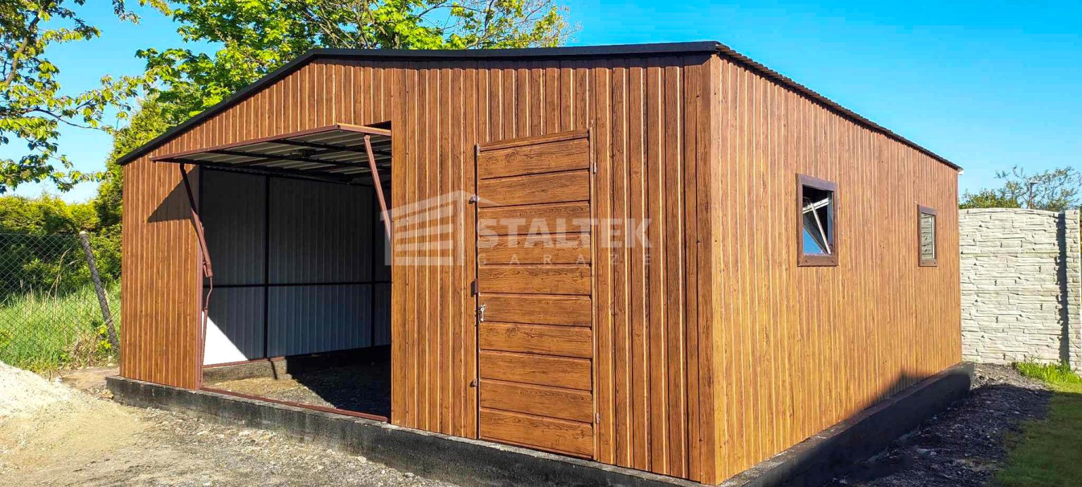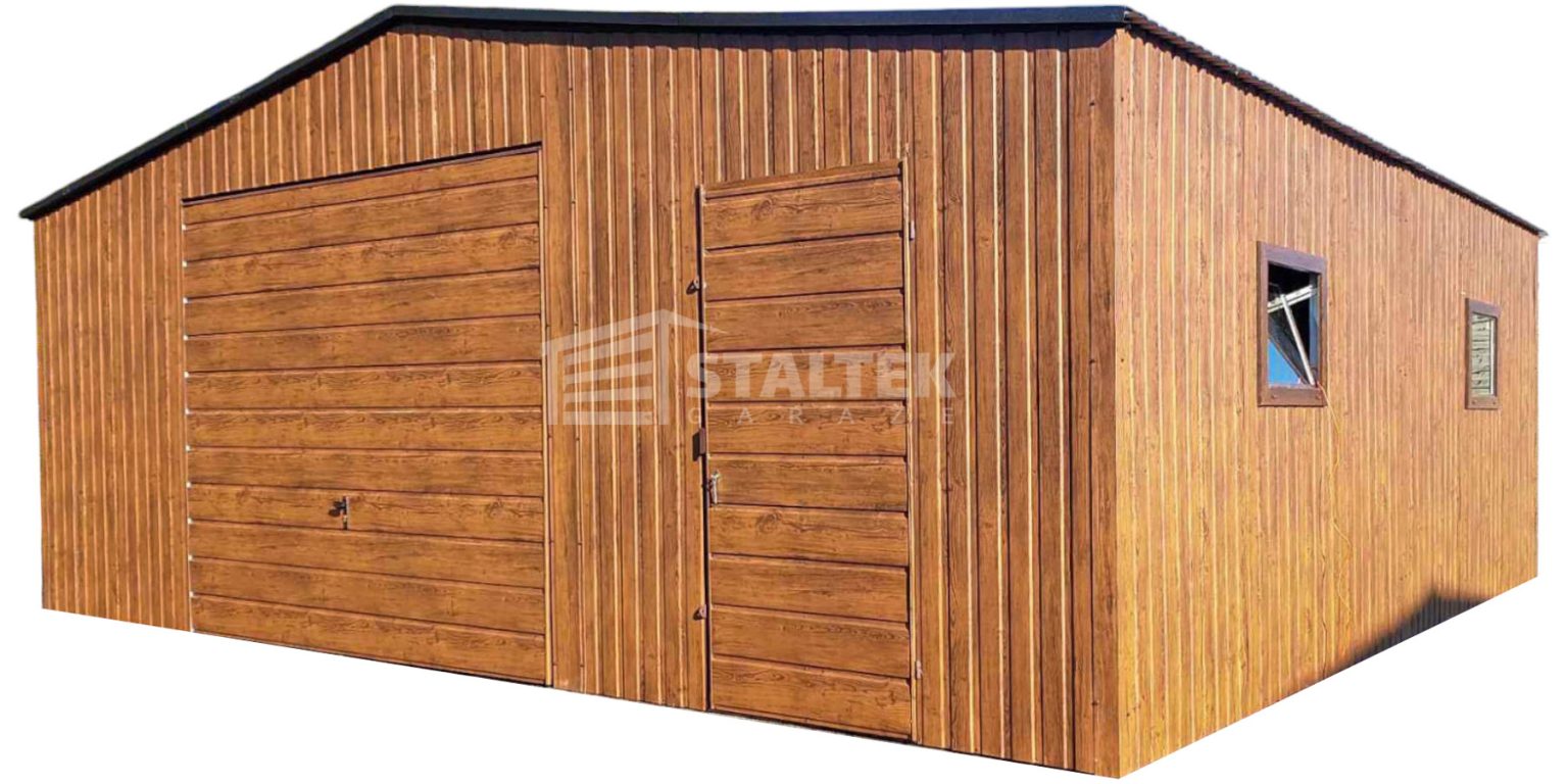 Garaż blaszany 6×6 Brama + drzwi + 2x okno drewnopodobny – jasny orzech + antracyt Dach dwuspadowy ST111
