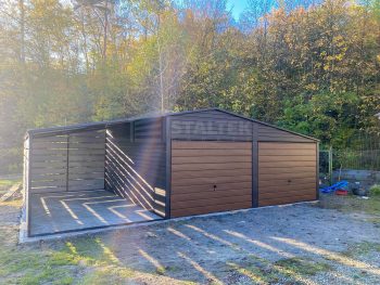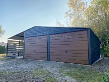 / Garaż blaszany 6x6m – wiata 3m – 2x Brama – Antracyt – ciemny orzech – drewnopodobny Dach dwuspadowy ST177