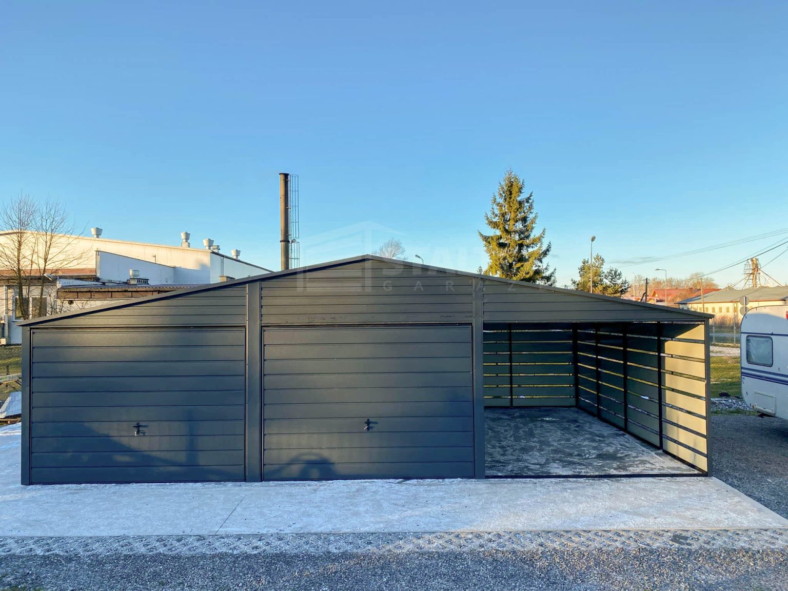 Garaż blaszany 6x6m – wiata 3m – 2x Brama – drzwi Antracyt Dach dwuspadowy ST176
