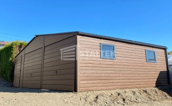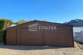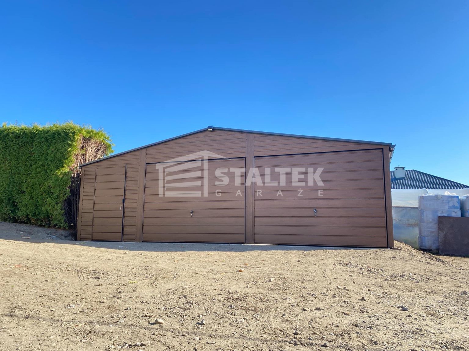 Garaż blaszany 8x6m – 2x Brama – drzwi – 2x okno – ciemny orzech – drewnopodobny – Dach dwuspadowy ST175