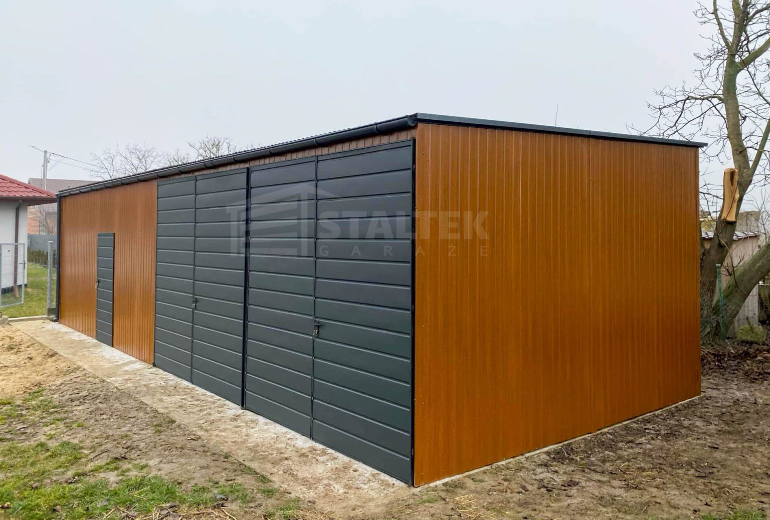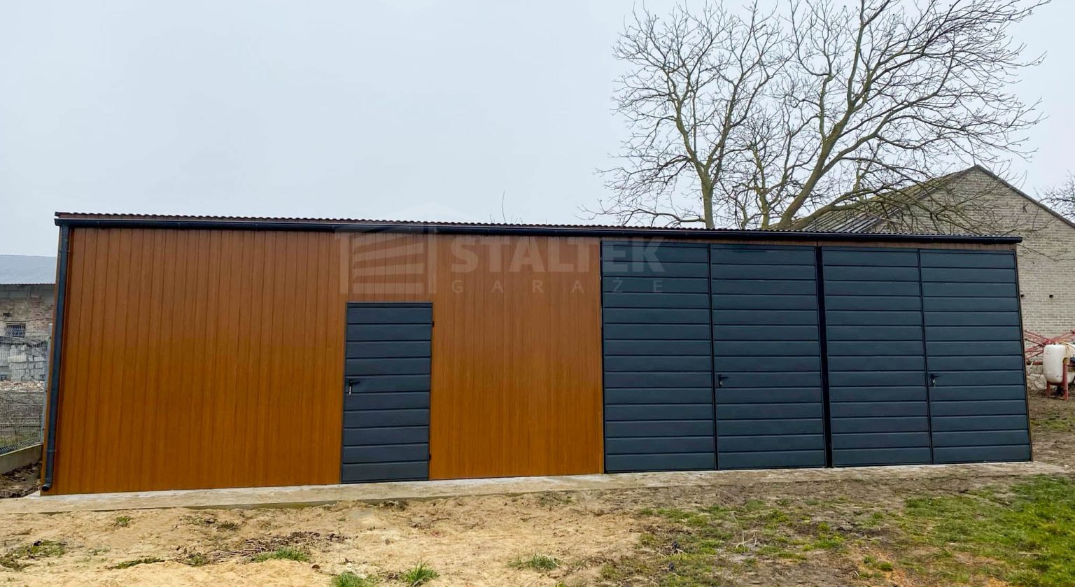 Hala Garaż blaszany 13×4 – 2x Brama + drzwi drewnopodobny Dach spad w przód ST164