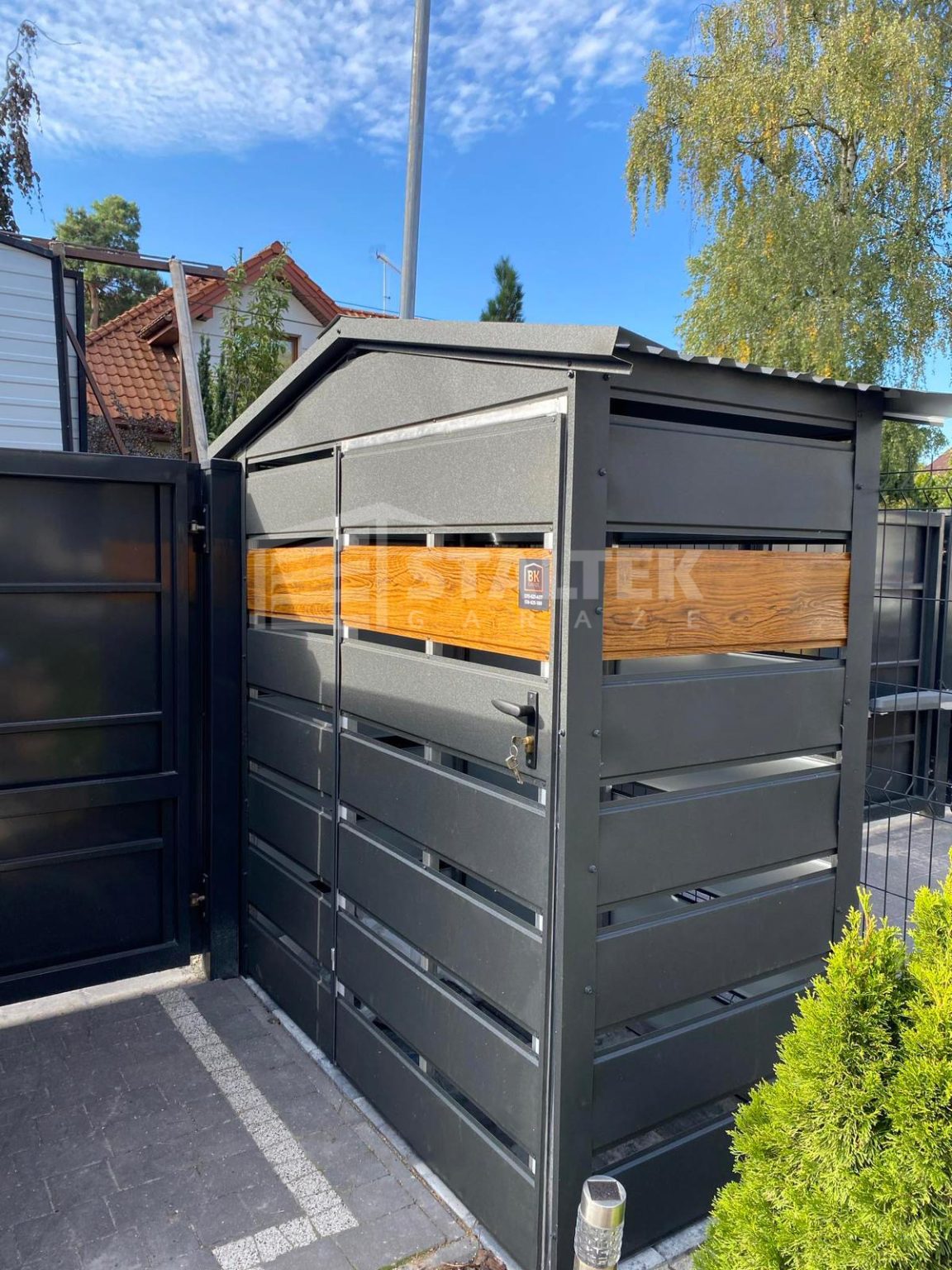 / Wiata śmietnikowa 1,5×0,5m antracyt + drewnopodobny – dach dwuspadowy ST156